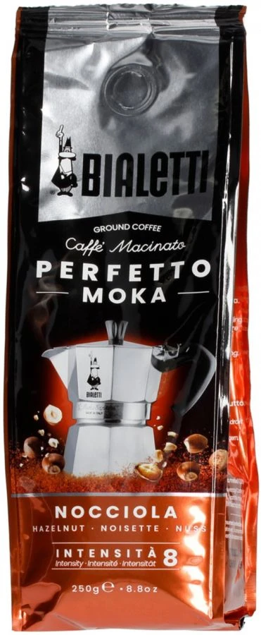 The Bialetti Perfetto Moka Nocciola is a flavoured gourmet coffee with a hazelnut aroma featuring roasted notes and a rounded, delicate flavour. The blend consists of 50 % Arabica from Colombia and 50 % Robusta, with hazelnut flavouring and extract. Full-bodied, intense and sweet, with the highlighted notes of hazelnut.