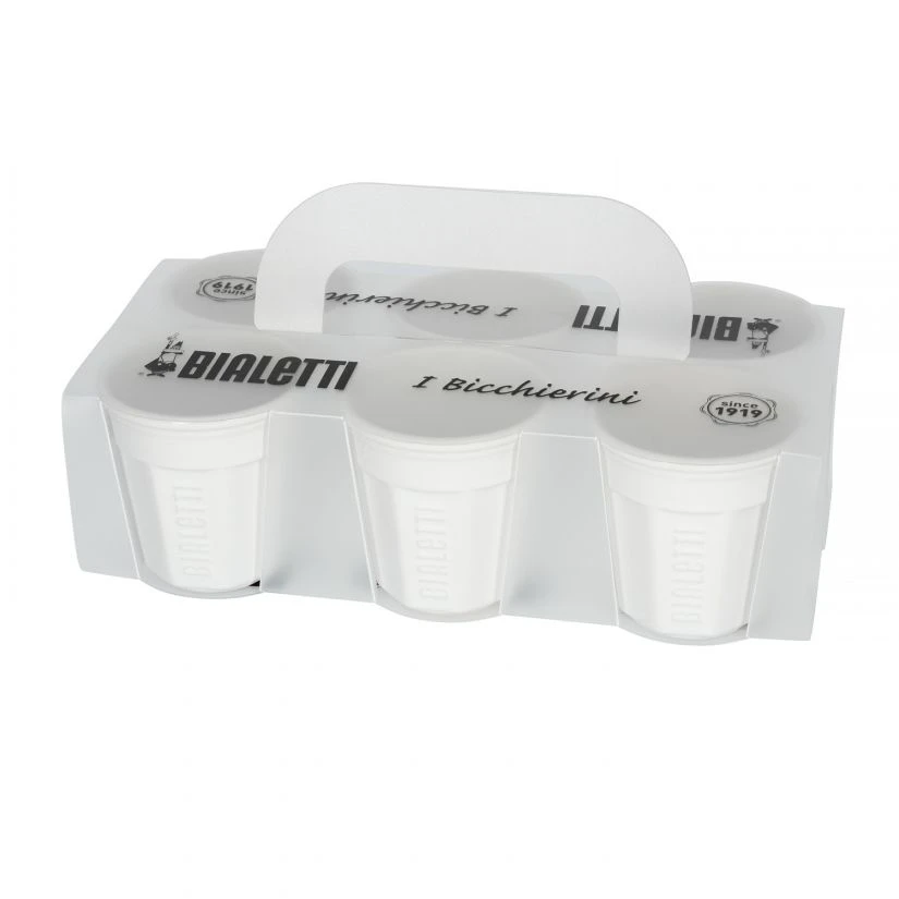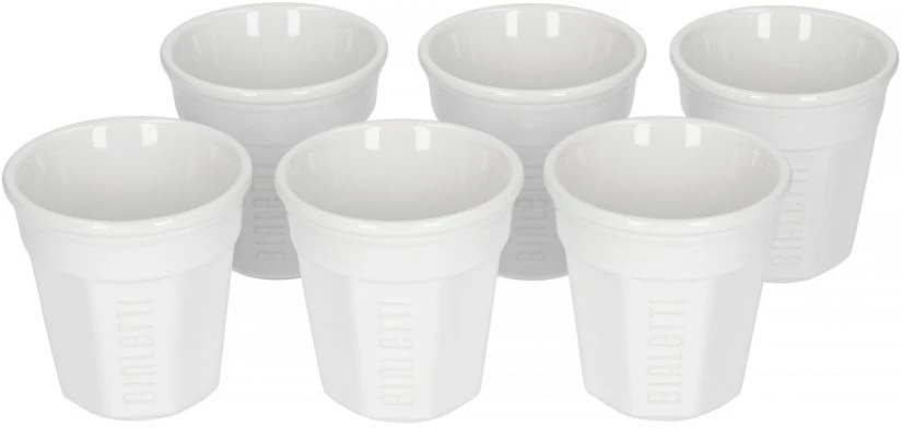 A set of white original Bialetti espresso cups made of durable stoneware ceramic. Each cup is patterned with an embossed outline of the Alfonso Bialetti-logo.