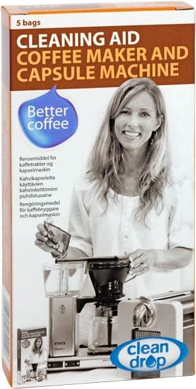 Fill the container with lukewarm water. Add one bag of Clean Drop and start the coffee maker. After about one minute you turn the coffee maker off. Leave it for a few minutes for the solution to work properly.Then you turn the machine on again. Clean the pot and filter holder with the solution. Run clean water through the coffee maker a couple of times.