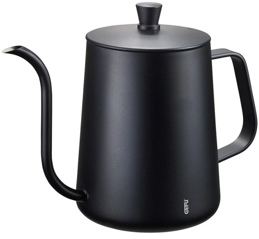 Gefu Cinero water kettle with gooseneck spout and a hole integrated in its lid for the insertion of a rod thermometer. Its black, matt-finished surface ensures that it will be an attractive eye-catcher in any kitchen.