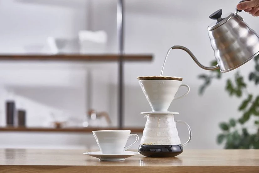 Stylish Hario V60 cup and saucer with the cult wave design. Handmade in Japan, from high quality porcelain. Created with use of a 400-year-old method.