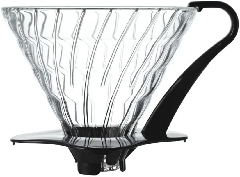The Hario Glass V60 Coffee Dripper has the same design as all other Hario V60 coffee drippers. It consists of ridges, a large hole in the middle and the V-shape, the only difference is that this dripper is made of glass and has a removable plastic handle.