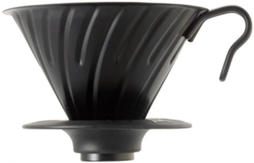 Hario’s V60 dripper made of steel, that uses size 02 filter papers. The dripper has a silicone base that keeps the dripper safely on a carafe while brewing coffee.