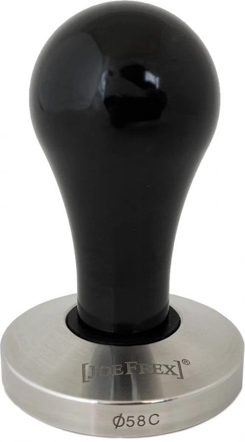 JoeFrex tamper with a convex stainless steel base and a powder-coated black aluminum handle. The JoeFrex tampers are hand-crafted, and the handles are ergonomically designed to ensure perfect grip and easy manual control.