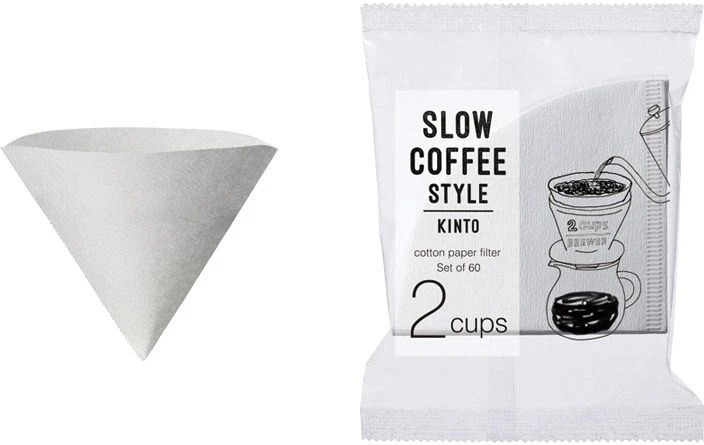 Paper coffee filters from Japanese Kinto for use in the SCS coffee drippers. The paper fits Kinto Slow Coffee Style drippers (size 2 cups), but they can also be used in Hario coffee drippers (size 01). The paper used in the filter is made of a blend of cotton pulp and wood pulp. Compared to Hario V60 papers, the Kinto paper is slightly thicker and more porous.