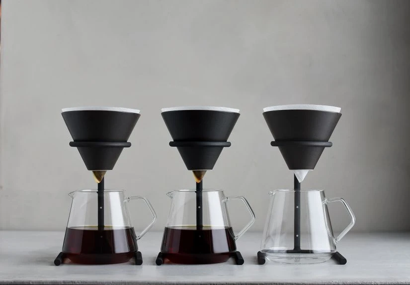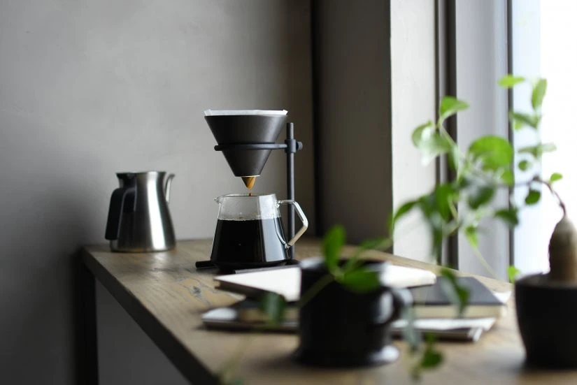 Brewer stand – Made by casting, the brewer stand intrigues with its rough look. It comes with a porcelain brewer with glaze rich in texture. The height of the stand can be adjusted, letting you use it with avarious vessels from a mug to a tall server.