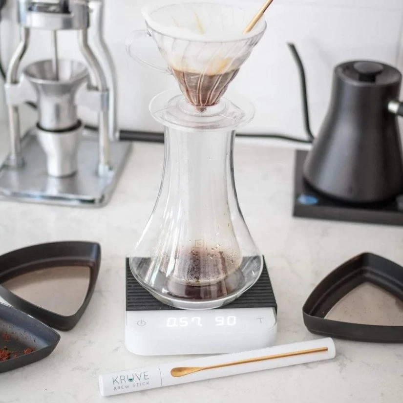 The Kruve EQ EVOKE coffee carafe is an elegant serving vessel. Perfect when we have guests, or when you want to enjoy multiple cups of coffee yourself. Double-walls keep the temperature of the beverage, yet they stay cool to the touch. Its rim diameter is 60 mm so you can use it with the most popular brewing devices such as dripper V60 from Hario (apart from the ceramic version).