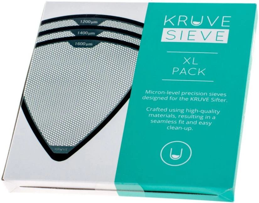 The Kruve Sieve XL 3 Pack contains the larger 1200µm, 1400µm and 1600µm coffee sieves (sifter base not included).