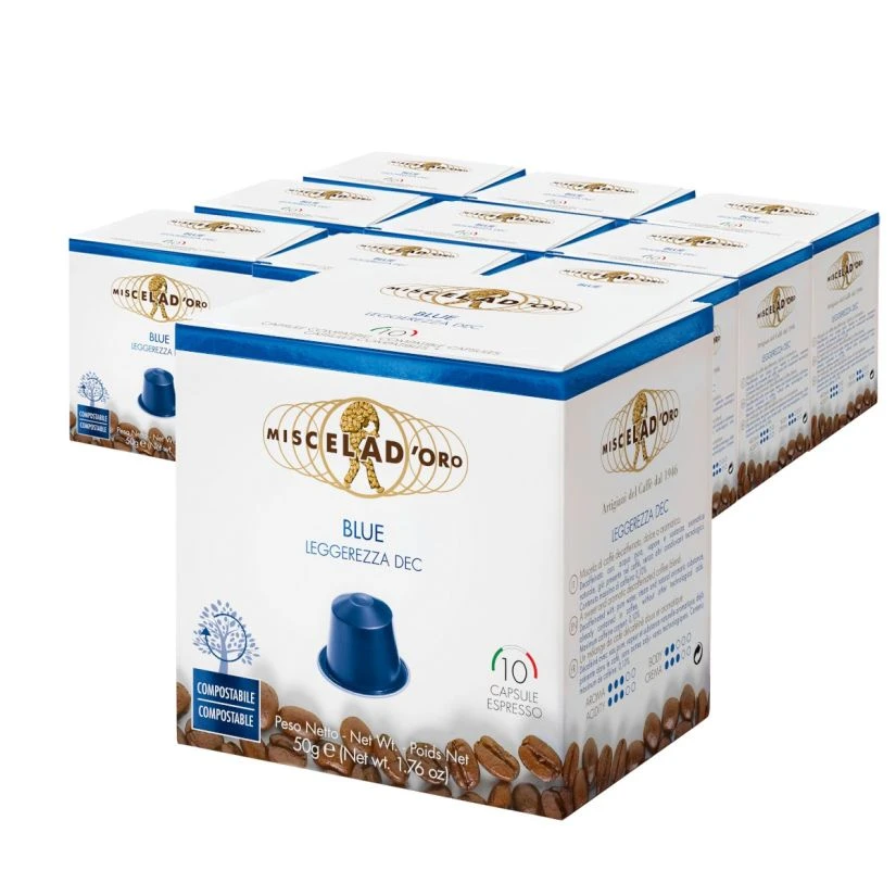 Miscela d’Oro Blue decaffeinated coffee capsules with 100 % Robusta blend – sweet, creamy, delicate, with a biscuit, tobacco and chocolate flavour. The smoothness is perfectly balanced with the the traditional taste of the italian espresso.