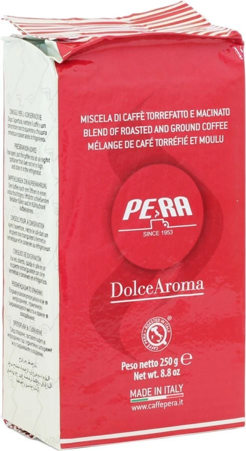 Italian Pera Dolce Aroma espresso coffee is a blend of the best Arabica (40 %) and Robusta (60 %) with a sweet flavor and rich aroma. Aromatic cup, with fine acidity, fruitiness, spiciness and intense aroma of cocoa. The aftertaste brings cocoa and dark chocolate flavours.