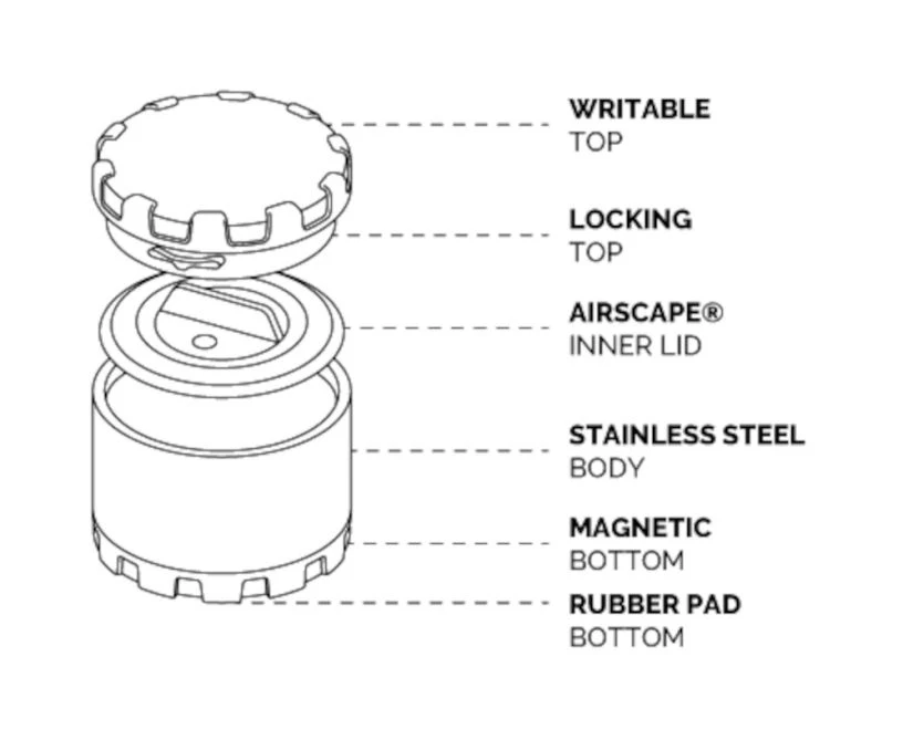 The BruTrek™ Cargo Can is perfect for pre-measured servings of coffee, tea or protein powder – enough for a day or weekend of adventures. Also ideal for preserving herbs, spices or any other goods that are oxygen, humidity & light sensitive. Features writable top lid and magnetic bottom.