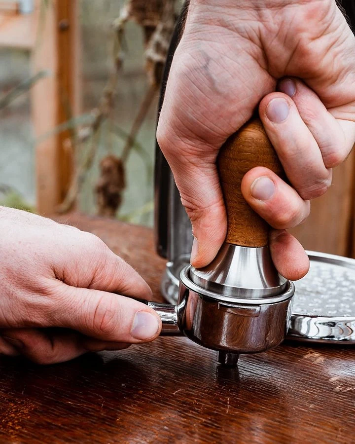 Tamping of the ground coffee in the portafilter ensures even extraction.