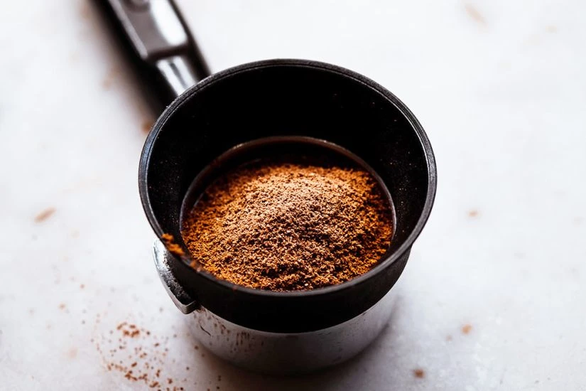 If you’re using a ROK grinder the coffee grounds are beautifully fluffy (the best grinders do this) and can overflow. Place the dosing funnel onto the filter basket, fill with fluffy coffee grounds, leave in place and tamp-through (if you have a ROK tamper) the funnel to avoid grind loss. (Place the funnel onto the portafilter before filling it with coffee).