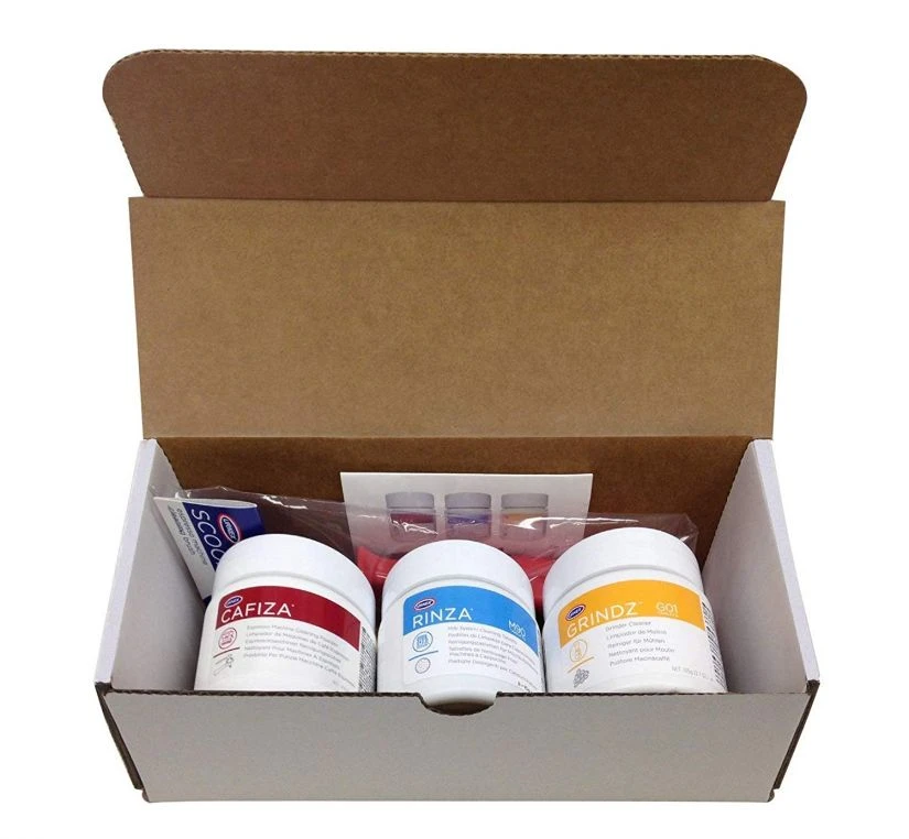 The Cafiza Café Starter Kit features trial-sized versions of cleaning products for espresso equipment, grinders, steam wands and batch brewers.