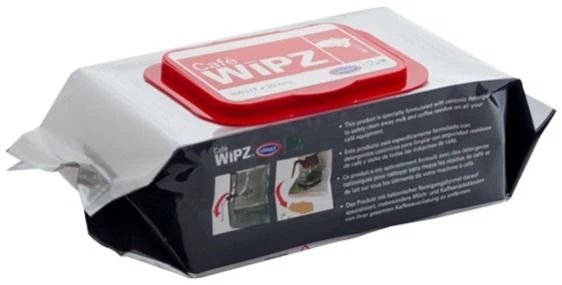 Urnex Café Wipz pre-moistened, fragrance-free coffee equipment cleaning wipes. For use on a variety of equipment and surfaces, including steam wands, bean hoppers, and countertops. Packaged with a resealable flip top to retain moisture and maintain freshness.